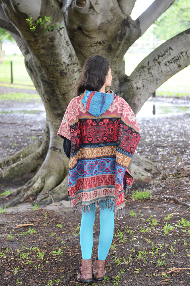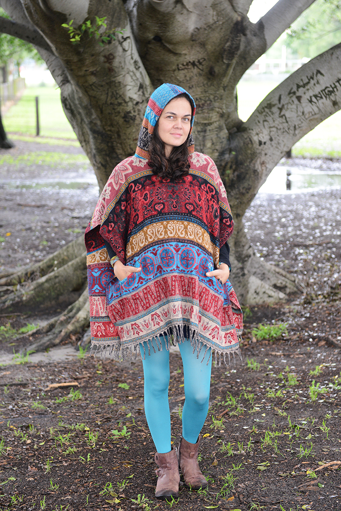 The poncho overlaps the body like a second skin while the hood cocoons the head and the pockets warm the hands.